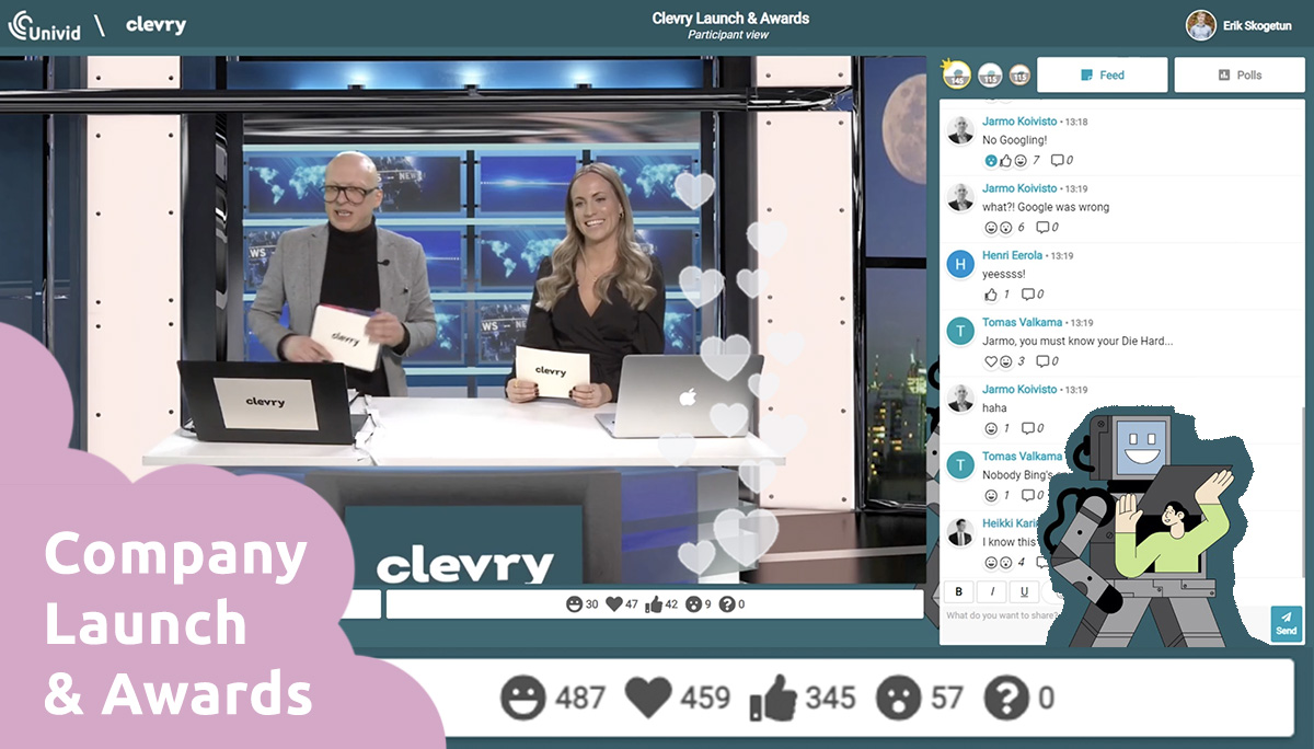 Clevry hosts a fun gameshow with music quiz and awards on Univid. Over 2400 total reactions with just 80 participants on the event platform. The event was streamed directly to Univid via RTMP and the HD stream was available on-demand right after the event for all the eager participants who could not get enough of the event or for people that missed it! A fantastic response from the audience.