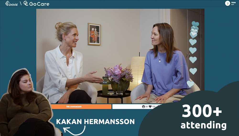 Go Care wanted a clean and stylish look, that went along with their graphic profile and touch. In just a few minutes the event page and session was up on Univid - branded with the Go Care logo and with the option to reduce down functionality to get a cinematic look - with just reactions, the stream and a CTA button to drive conversions.